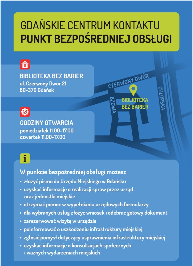 Kontakt Gdańsk otworzyło Punkt Bezpośredniej Obsługi w Bibliotece Bez Barier (ul. Czerwony Dwór 21)! Godziny otwarcia: poniedziałek 11:00–17:00 czwartek 11:00–17:00 W punkcie możesz m.in.: złożyć pismo do Urzędu Miejskiego w […]