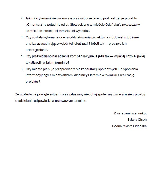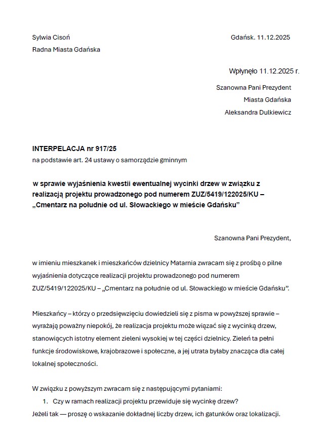 Sylwia Cisoń -Radna Miasta Gdańska złożyła 11 grudnia interpelację dotyczącą projektu prowadzonego pod numerem ZUZ/5419/122025/KU – „Cmentarz na południe od ul. Słowackiego w mieście Gdańsku”.