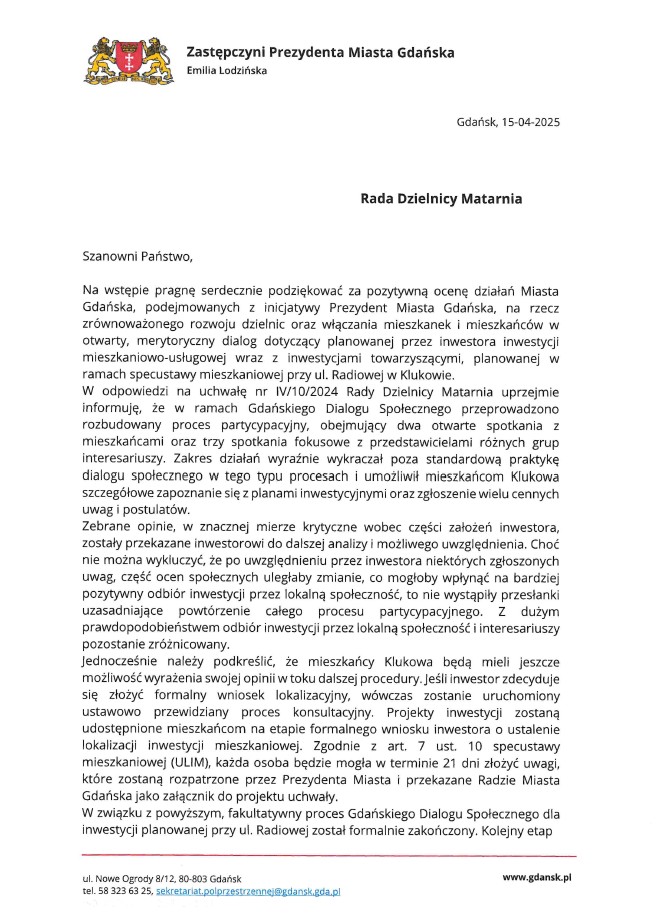 31 grudnia 2024 r. Rada Dzielnicy Matarnia przekazała do Miasta uchwałę dotyczącą planowanej inwestycji mieszkaniowej przy ul. Radiowej w Klukowie.