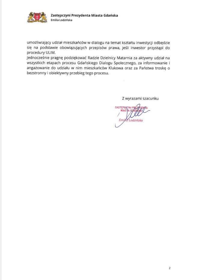 W odpowiedzi, datowanej na 15 kwietnia 2025 r., Zastępczyni Prezydenta Miasta Gdańska – pani Emilia Lodzińska podziękowała Radzie Dzielnicy za aktywny udział w procesie Gdańskiego Dialogu Społecznego oraz zaangażowanie w informowanie i mobilizowanie mieszkańców Klukowa.
