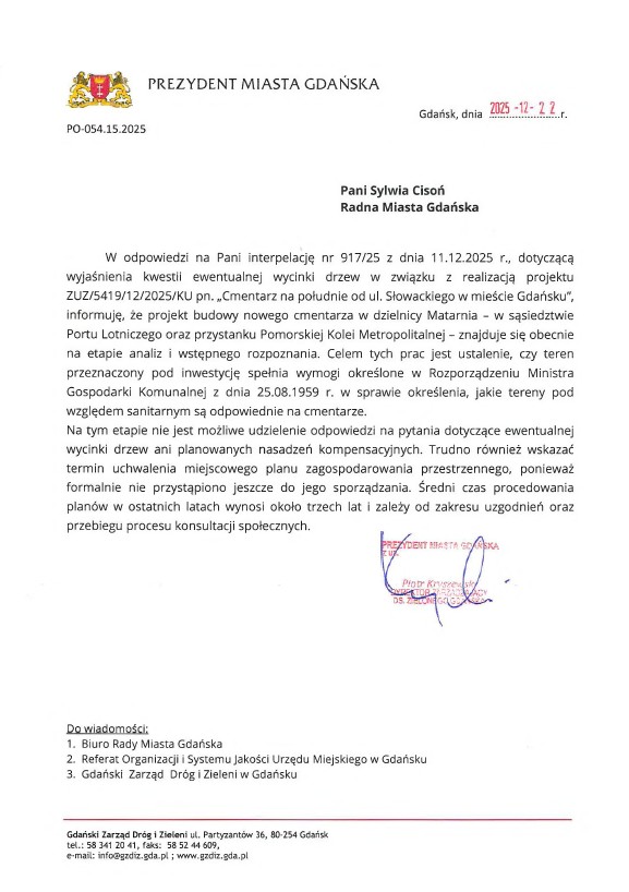 W dniu 22.12.2025 r. Sylwia Cisoń – Radna Miasta Gdańska otrzymała odpowiedź na interpelację dotyczącą możliwej wycinki drzew w związku z planowanym projektem budowy nowego cmentarza na południe od ul. Słowackiego, w sąsiedztwie Portu Lotniczego i przystanku PKM.
