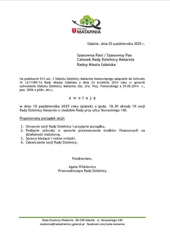 Zaproszenie na VII Sesję Rady Dzielnicy
