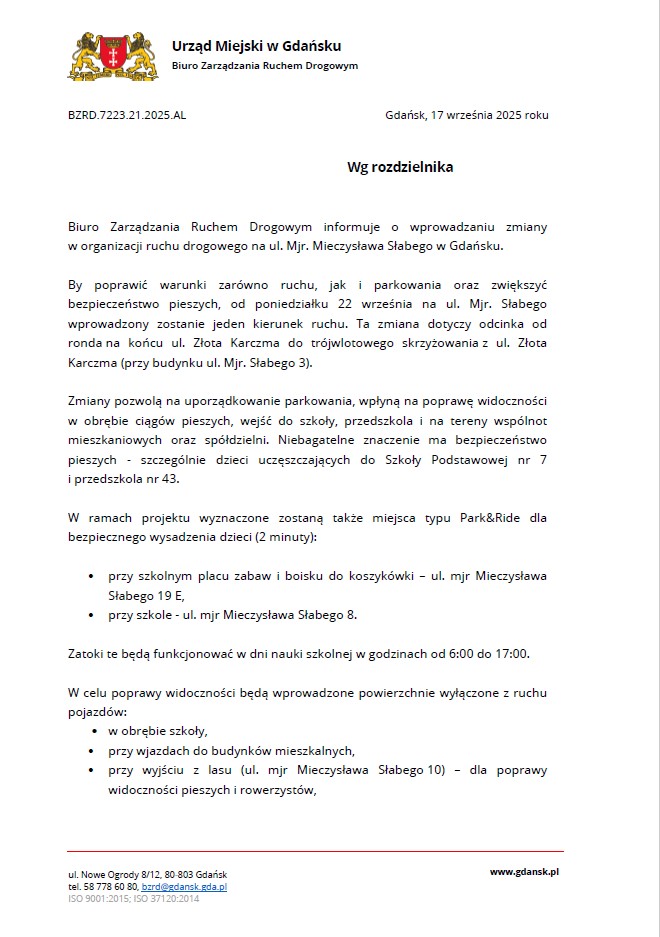 Od poniedziałku, 22 września 2025 r. na ul. Mjr M. Słabego zostanie wprowadzony ruch jednokierunkowy na odcinku od ronda przy ul. Złota Karczma do trójwlotowego skrzyżowania z ul. Złota Karczma.