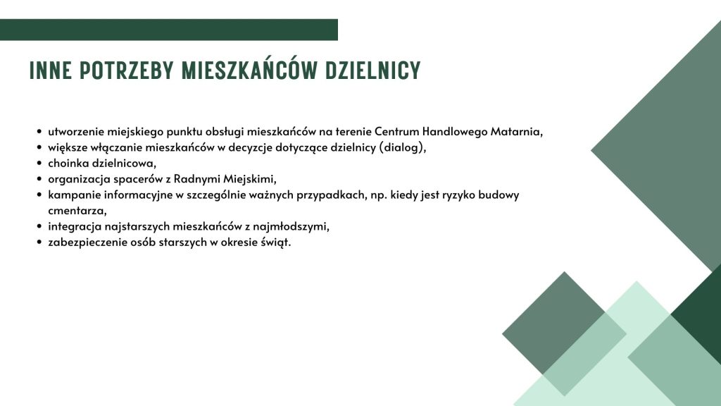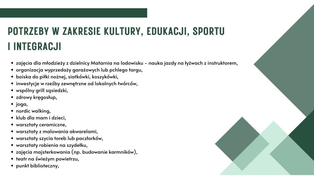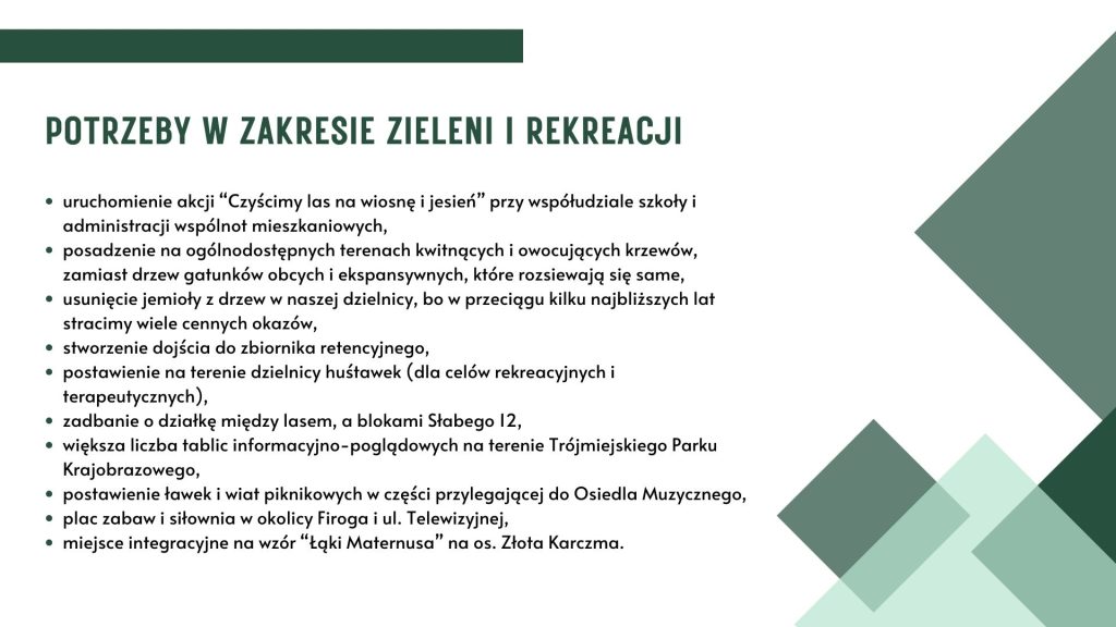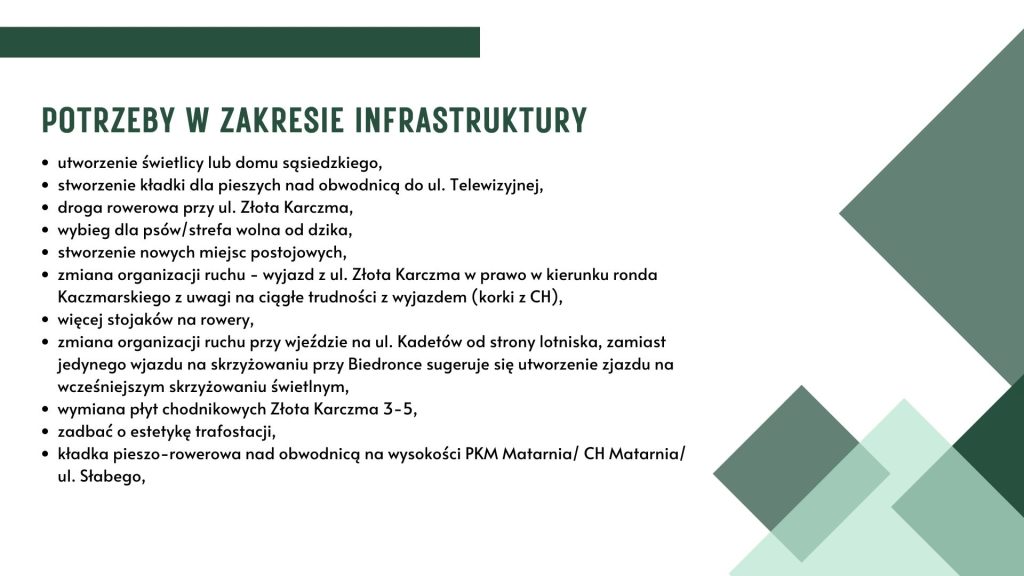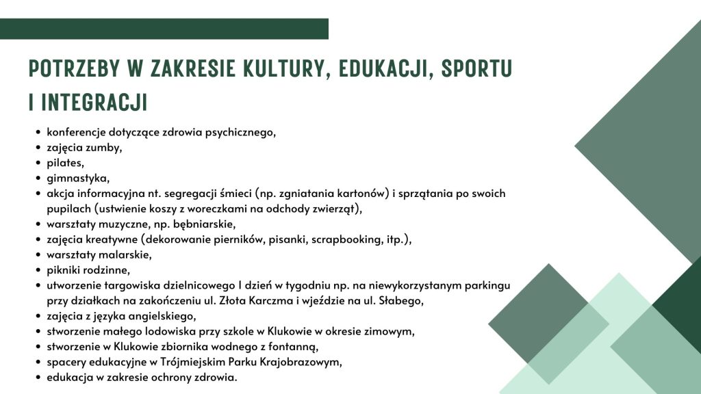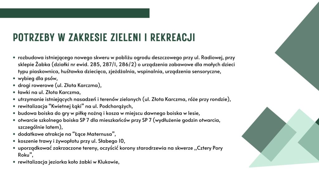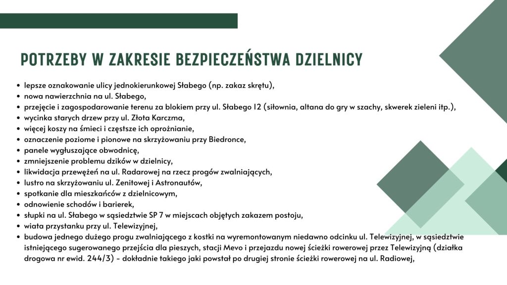 W zgłoszeniach pojawiło się także wiele konkretnych potrzeb dotyczących bezpieczeństwa, zieleni, infrastruktury oraz kultury i integracji — od chodników i oświetlenia, przez rewitalizację skwerów, po zajęcia sportowe i warsztaty dla mieszkańców.