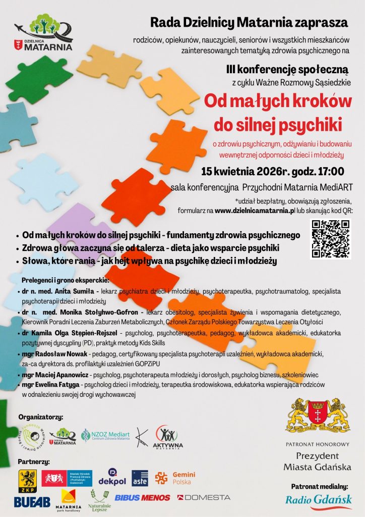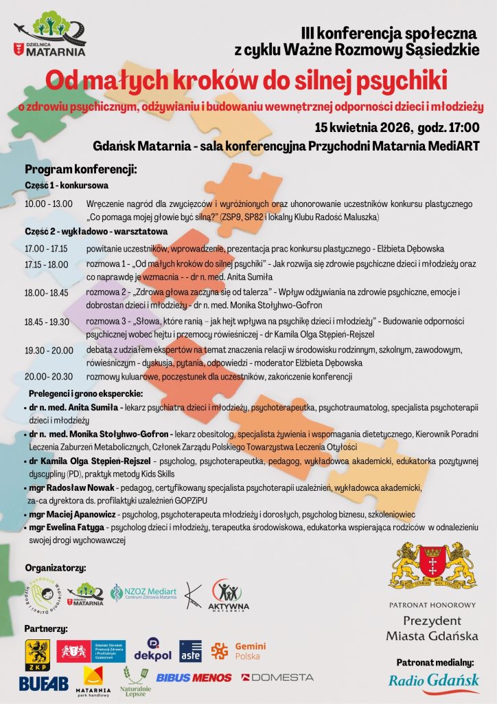 Dlatego zapraszamy Was na III Konferencję Społeczną z cyklu „Ważne Rozmowy Sąsiedzkie” pt. „Od małych kroków do silnej psychiki – o zdrowiu psychicznym, odżywianiu i budowaniu wewnętrznej odporności dzieci i młodzieży”