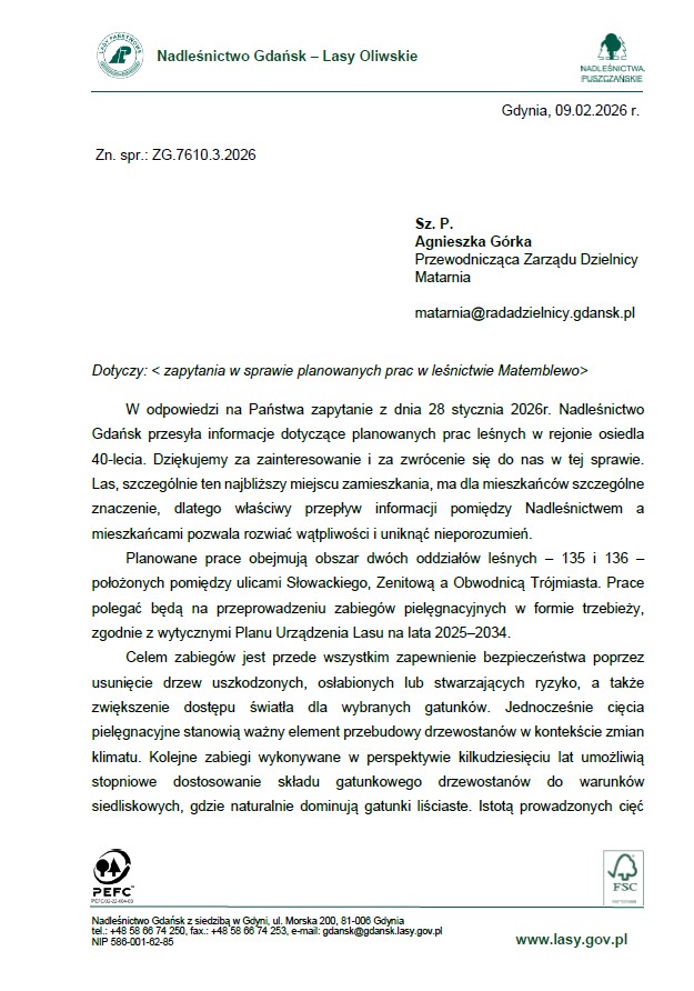 Otrzymaliśmy dzisiaj odpowiedź z Nadleśnictwo Gdańsk, Lasy Państwowe dotyczącą planowanych prac w leśnictwie Matemblewo, w bezpośrednim sąsiedztwie osiedla 40‑lecia.