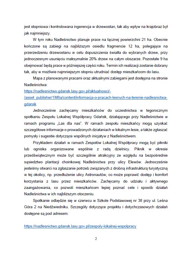 Jak podkreślono w piśmie, „las, szczególnie ten najbliższy miejscu zamieszkania, ma dla mieszkańców szczególne znaczenie”, dlatego Nadleśnictwo przekazało szczegółowe informacje o działaniach zaplanowanych na ten rok.